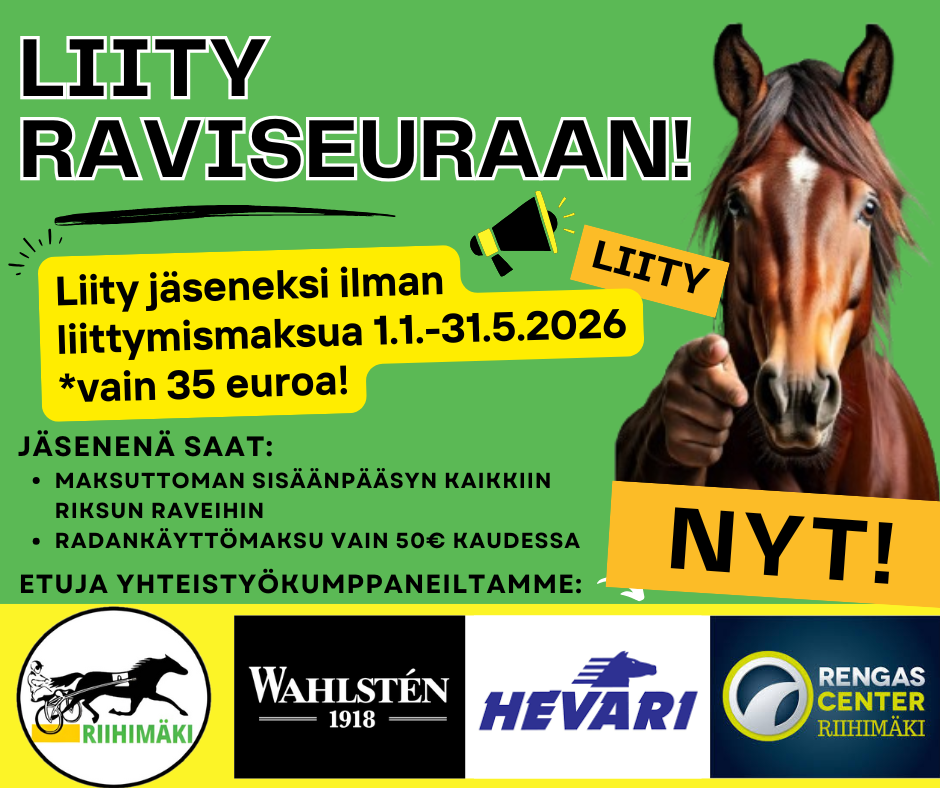 Riihimäen raviseuran jäsenenä tuet raviradan käyttömahdollisuuden säilyttämistä ja alueen hevosurheilua. Ja mikä parasta, pääset mukaan mukavaan porukkaan! Innokkaille talkoolaisille löytyy hommia ravikauden aikana.